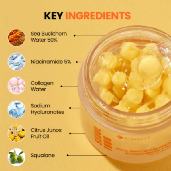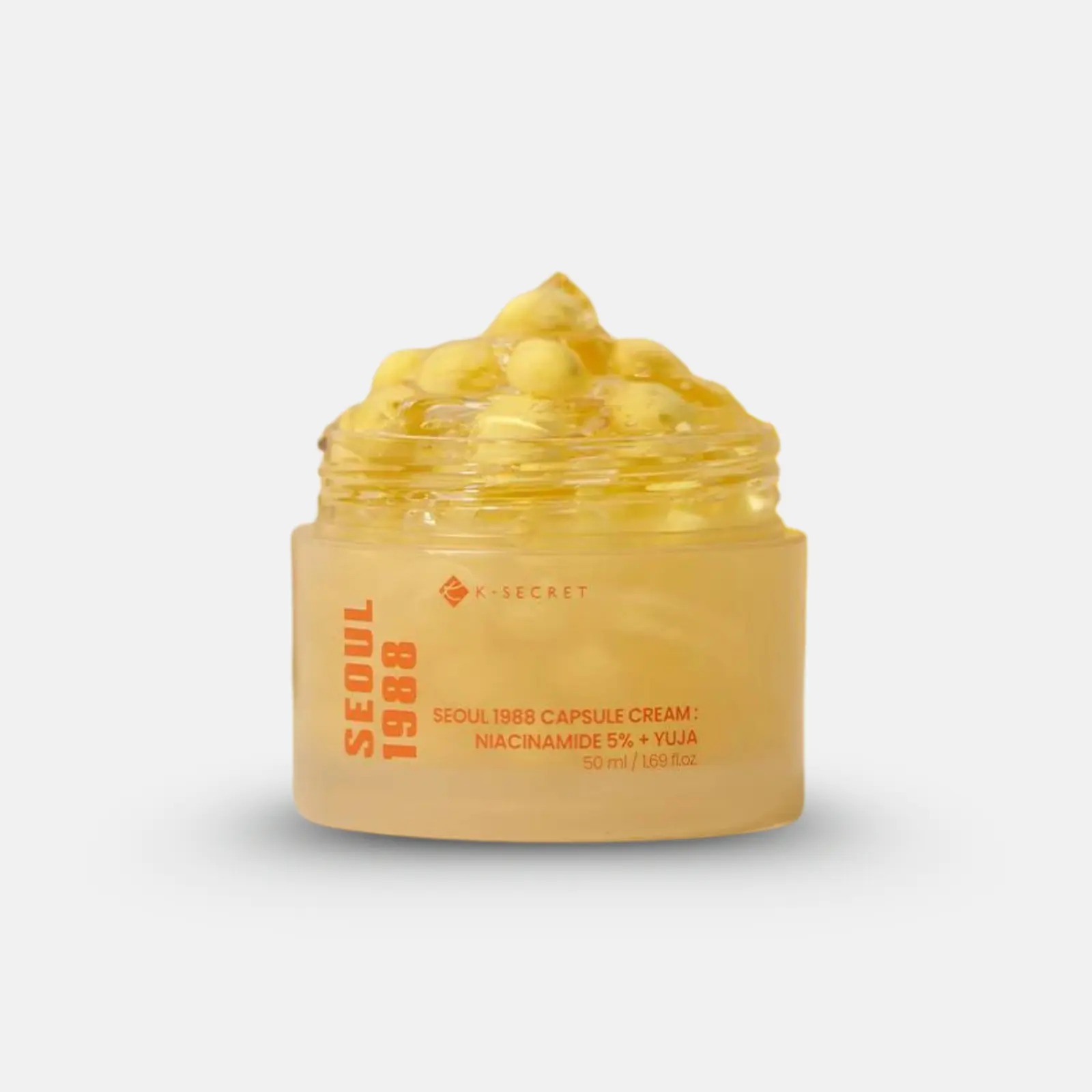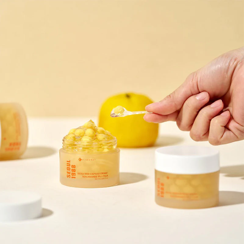 Η Seoul 1988 Capsule Cream είναι μια διπλής υφής κρέμα που συνδυάζει διάφανο ενυδατικό gel με μικρο-κάψουλες βιταμινών Yuja, οι οποίες «σπάνε» κατά την εφαρμογή και απελευθερώνουν φρέσκο, συμπυκνωμένο θρεπτικό blend. Με Niacinamide 5%, Yuja extract και Vitamin C capsules, χαρίζει έντονη λάμψη, ομοιόμορφο τόνο και πιο λεία, φωτεινή επιδερμίδα από τις πρώτες χρήσεις. Ιδανική για δέρματα που έχουν ανάγκη από λεύκανση, ενυδάτωση και αναζωογόνηση χωρίς λιπαρότητα.