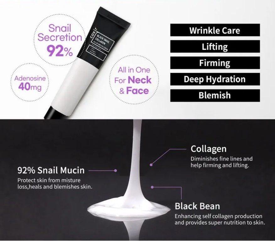 Η σύνθεσή της περιέχει 92% έκκριμα σαλιγκαριού, 40mg αδενοσίνης, κολλαγόνο , εκχύλισμα μαύρου φασολιού και μαύρου ρυζιού. Ακόμη, θρέφει και βελτιώνει την ελαστικότητα του δέρματος. Η Black Snail Collagen All In One Eye Cream περιέχει μαύρο ρύζι, μαύρο φασόλι και μαύρο σουσάμι . Τα μαύρα τρόφιμα είναι πλούσια σε ανθοκυανίνη, η οποία έχει τη δυνατότητα να προστατεύει το δέρμα από τις βλάβες της υπεριώδους ακτινοβολίας. Τέλος, βοηθά στην προστασία του δέρματος από την απώλεια υγρασίας, αλλά και στην βελτίωση των ατελειών.