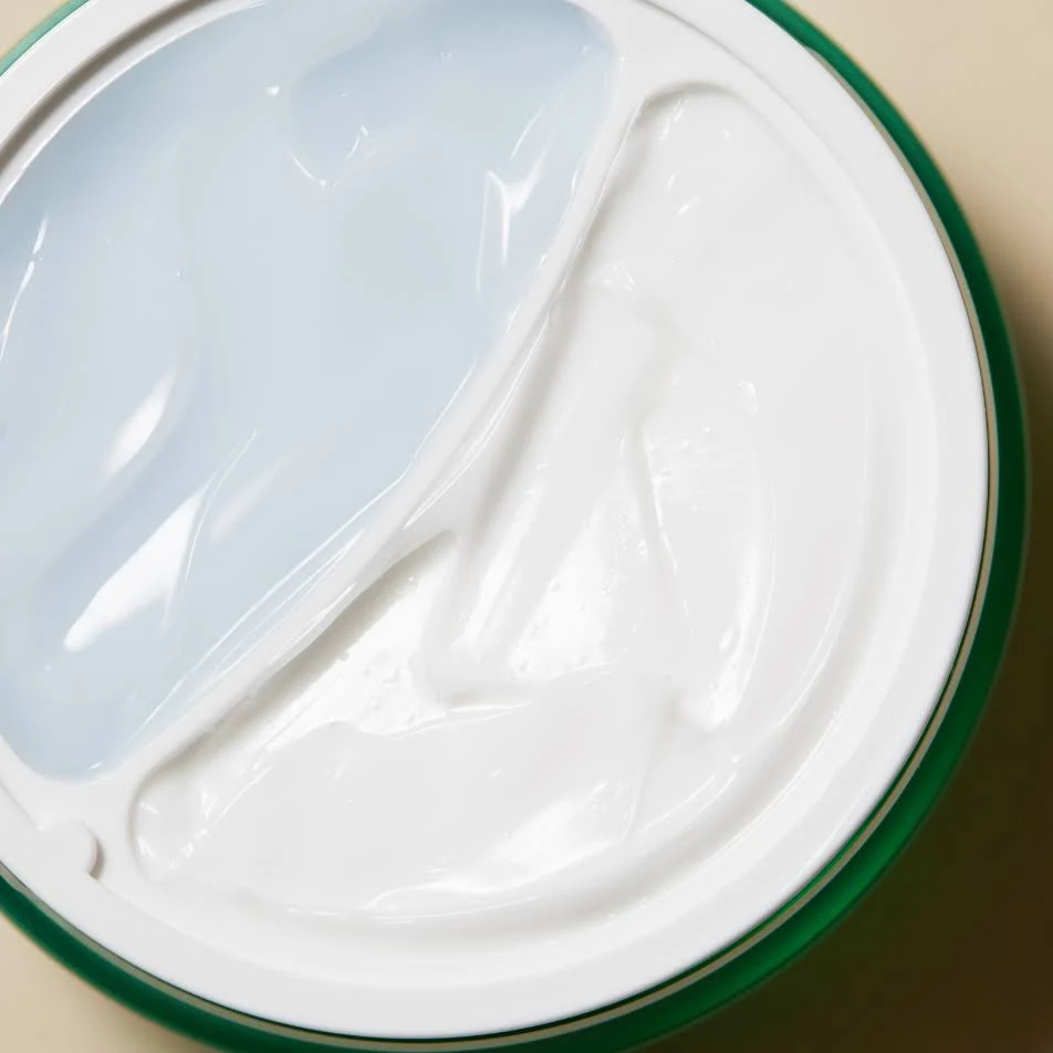 - Πρώτον, υπάρχει η μπλε κρέμα- τζελ, μια ελαφριά φόρμουλα που ενυδατώνει τις πιο λιπαρές περιοχές. Ωστόσο, έχει την ιδιότητα να μην τους προσθέτει επιπλέον λιπαρότητα. Επιπλέον, προσφέρει καραπραϋντικά, ρυθμιστικά και αντιοξειδωτικά οφέλη. Αυτή η κρέμα – τζελ περιέχει εκχυλίσματα φύλλων heartleaf , φασκόμηλου και γλυκόριζας.
